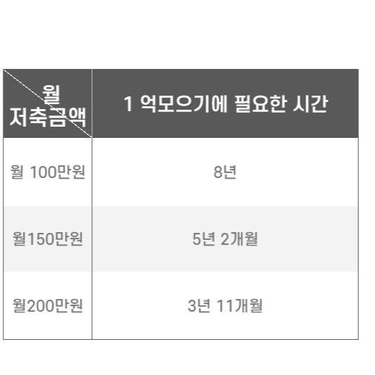 100만원, 150만원, 200만원을 저축한다고 가정했을 때 1억 모으기에 필요한 시간은 다음과 같습니다.
