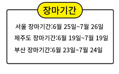 제주도는 이보다 일주일 정도 빠르게 6월 19일~7월 19일, 남부지방은 6월 23일~7월 24일까지로 진행됩니다.